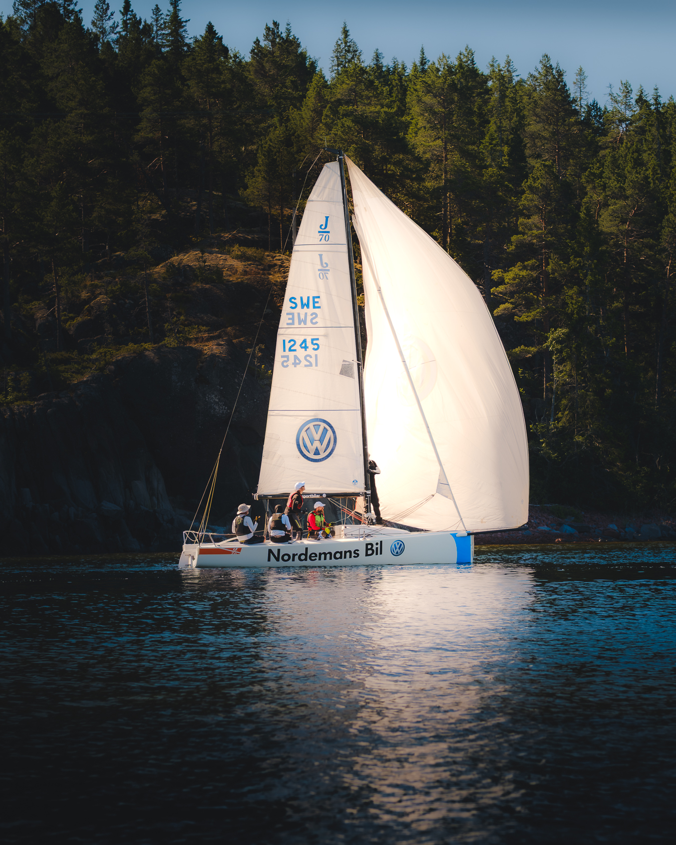 The image is of a J/70 heading out to the start line of the 2025 Ulvö regatta at the High Coast of Sweden. The Ulvö regatta has been around for a long time, in 2009 it celebrated its 100th anniversary with over 100 participating boats.